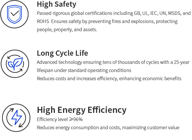 • Worldwide certifications: UL9540A, UL1973, IEC62619, IEC61000 and UN38.3